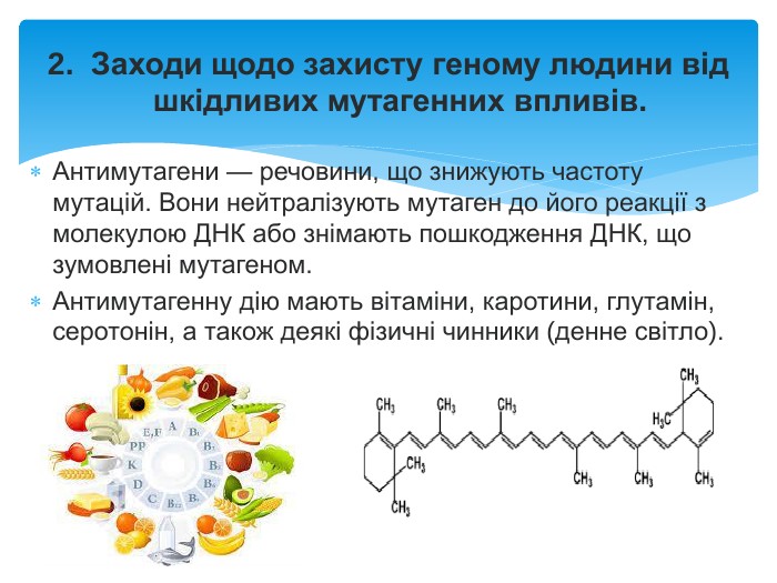 - Запобігання ушкодження: деякі антимутагени можуть захистити клітини від потенційних ушкоджень. Наприклад, ті, що містяться у деяких овочах та фруктах.
