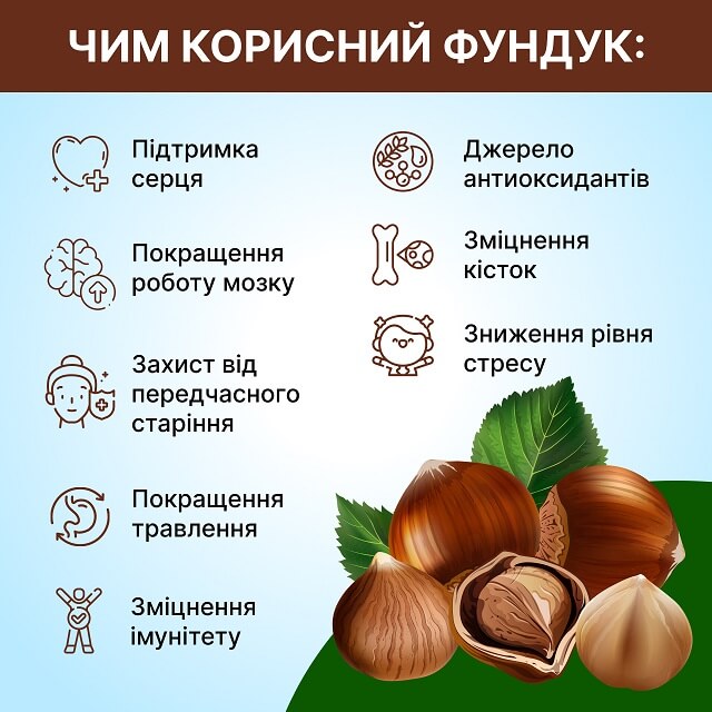 Фундук, відомий ще як лісовий горіх, набуває все більшої популярності через його корисні властивості та унікальний смак. Але чим саме корисний фундук для нашого організму? Давайте розглянемо це детальніше.