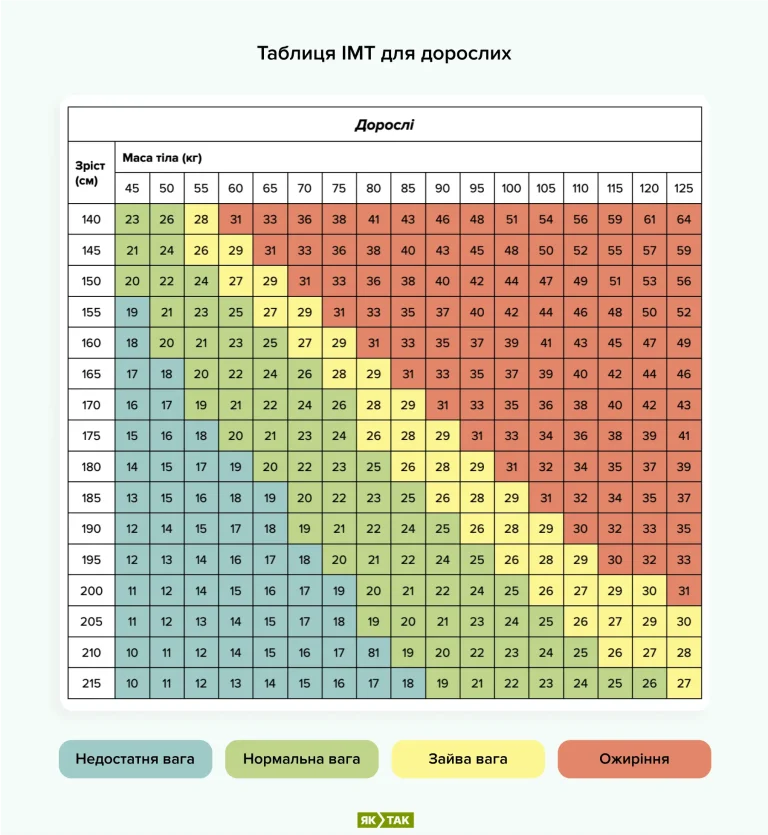 • Індекс маси тіла (ІМТ): найпоширеніший метод підрахунку.