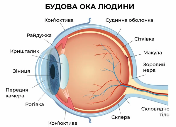 - Функція: захищає око від пилу й бактерій та допомагає фокусувати світло.