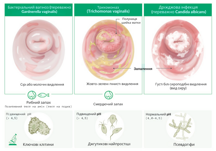 - Є інші симптоми, як-от біль або свербіж.