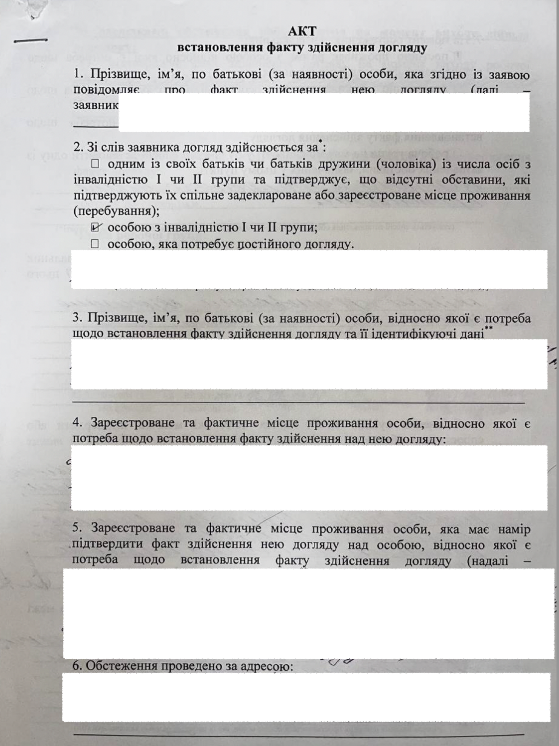 - Паспортні дані особи, що надає догляд.