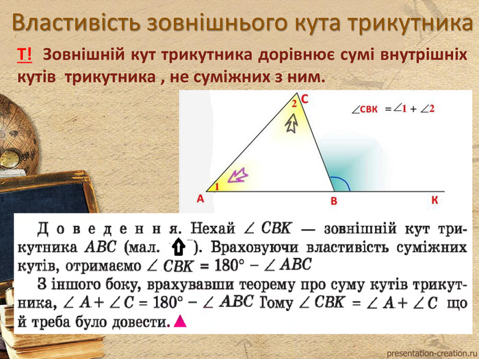 - Зовнішній кут дорівнює сумі двох внутрішніх кутів, що не прилягають до нього.