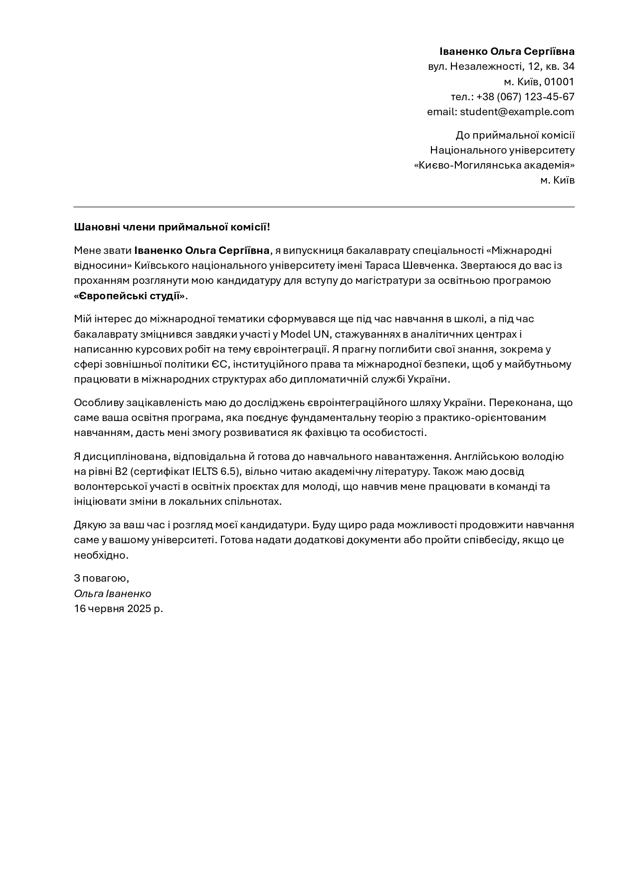 • Основна частина: Поділіться своїм досвідом, досягненнями, намірами. Не забудьте про особистий тон.